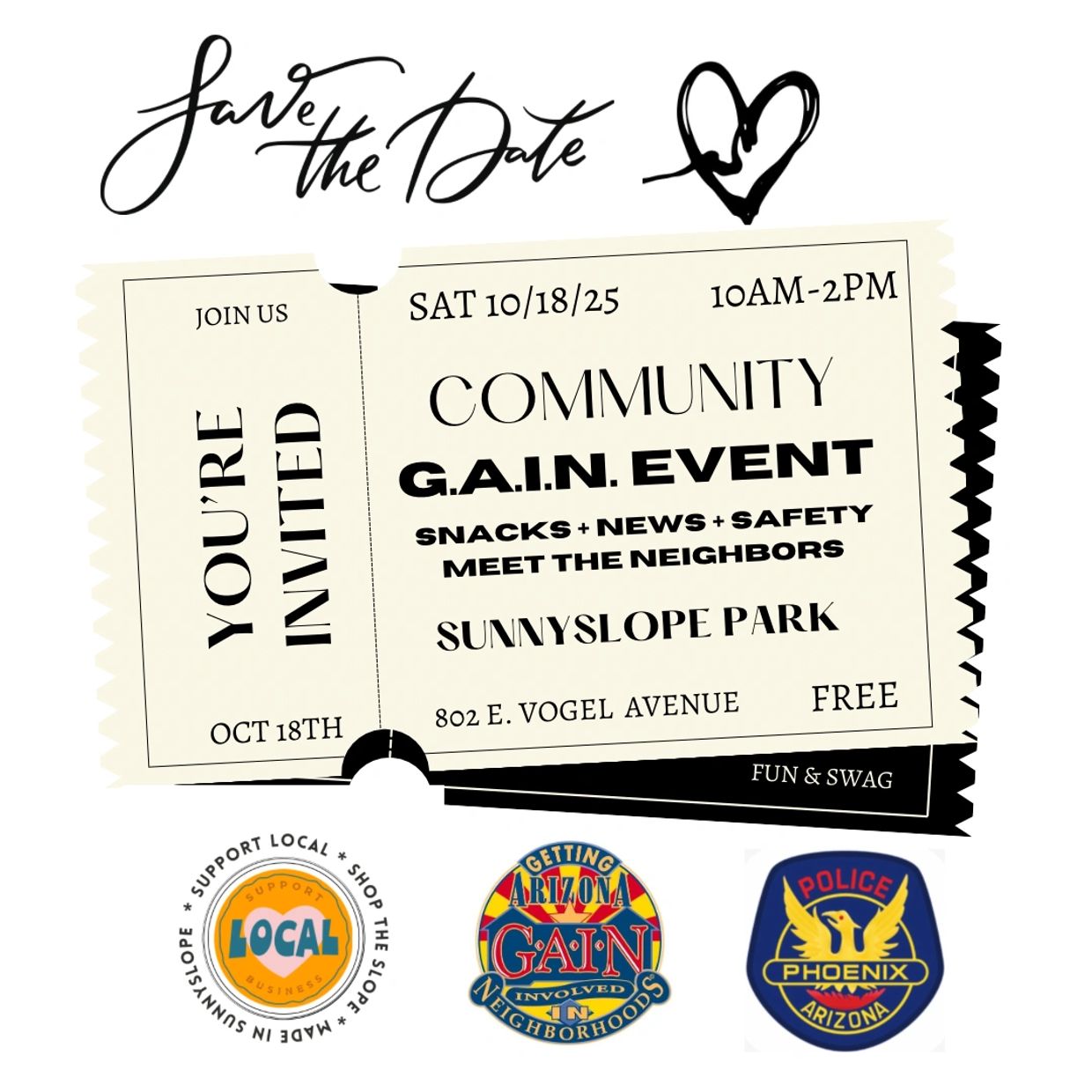 A fun + free event for the whole community. This event showcases all the neighborhood groups and nonprofits in Sunnyslope, AZ. With a focus on crime preventions, resources, and safety tips. Meet Neighborhood Leaders, City Officials, Local Volunteers in our community. This is a free event with fun and games for kids, grilled food + drinks. Sunnyslope Park at the Sunnyslope Community Center, 802 East Vogel Avenue, Phoenix, AZ 85020 10AM-2PM